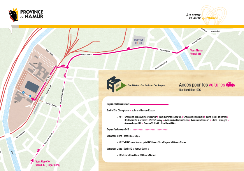 • Se rendre à son bureau : MAP – rue H. Blès 190 C à 5000 Namur (Salzinnes) – Plan d’accessibilité à la MAP